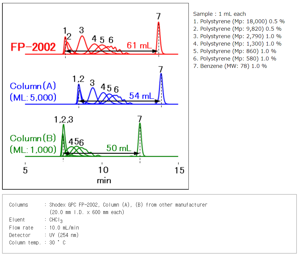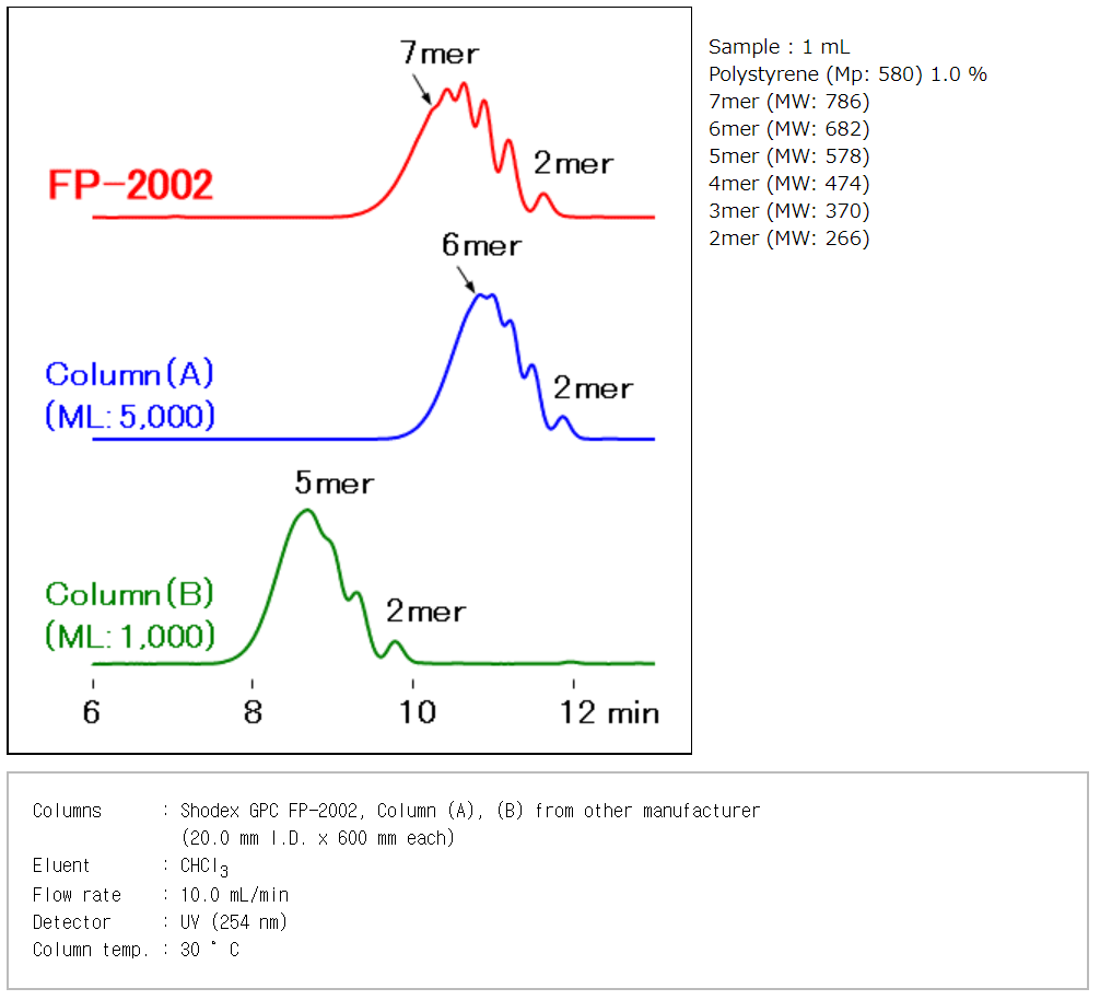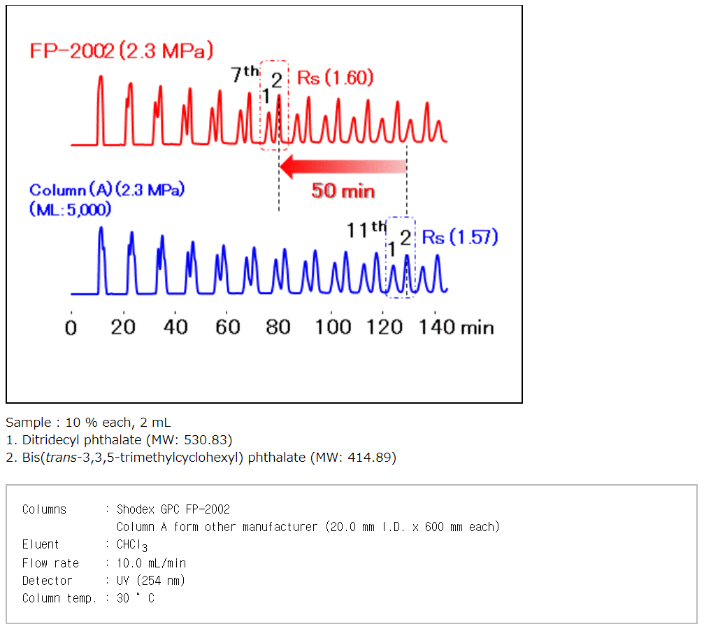 Shodex FP-2002 컬럼은 이러한 Recycle분취 시 분리도를 개선하여 시간과 이동상의 절약을 실현하였습니다.