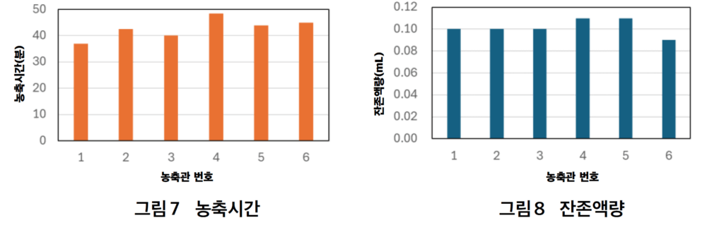 분석 수행 결과 최종 액량까지의 농축 시간은 37~45분, 최종 액량은 0.09~0.11mL의 범위로 작업 효율화의 향상을 기대할 수 있었음.