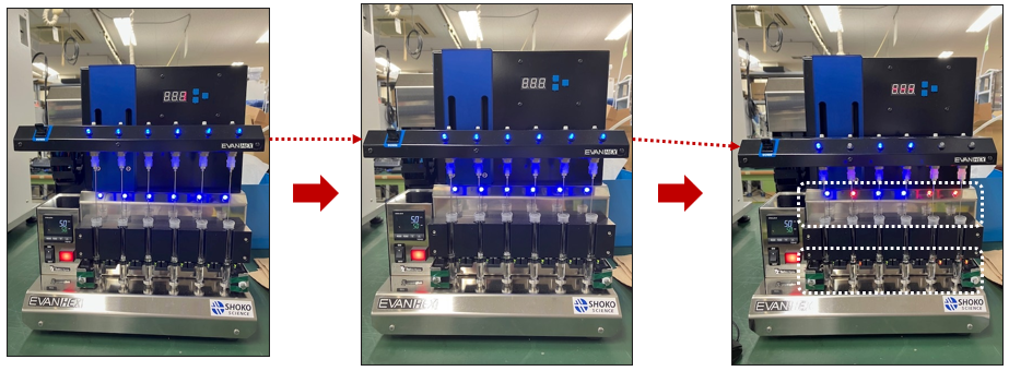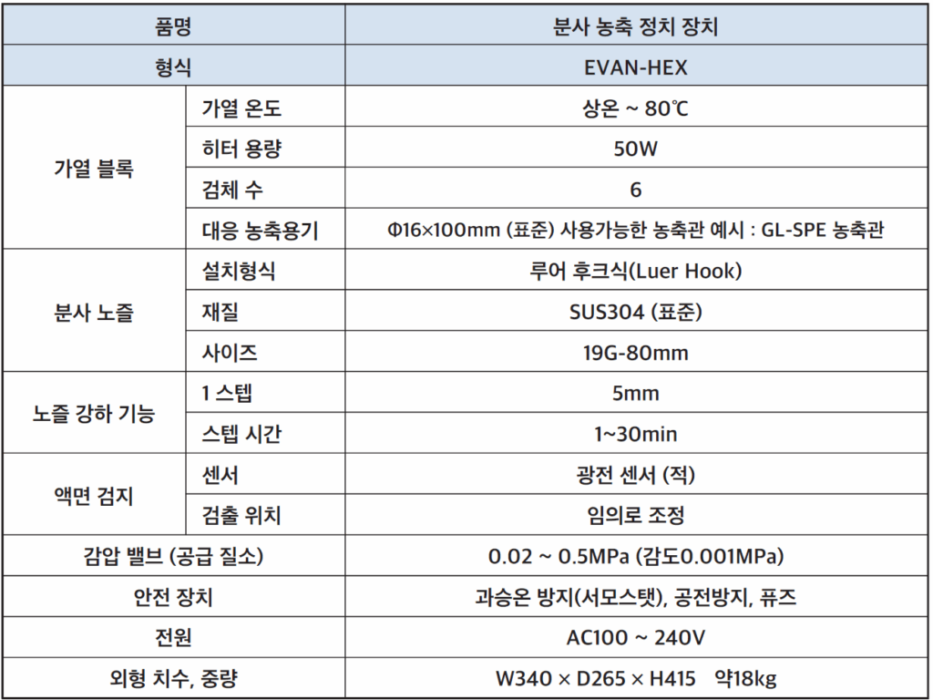 EVAN-HEX는 질소를 분사하여 농축을 시키는 장치로 시간에 따라 자동적으로 분사 노즐이 하강하여 시료를 농축시키는 장치입니다.