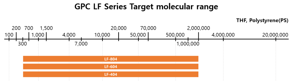 Shodex LF Series는 광범위한 분자량을 분석할 수 있는 최적의 Universal 컬럼 입니다.